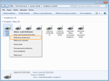 Kliknij prawym przyciskiem myszy ikonę faksu, a następnie wybierz pozycję [Printing preferences] (Preferencje drukowania).