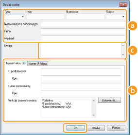 Wprowadź numer(y) faksu. W razie potrzeby między cyframi można umieścić myślniki. Aby dodać objaśnienie do numerów faksu, np. „Dom” czy „Biuro”, wprowadź je w pozycji [Opis].