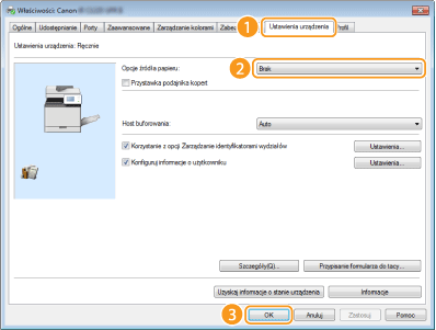 Możesz użyć sterownika drukarki PCL5c, PCL6 i PS, a także UFRII. Dostępne ustawienia drukowania różnią się w zależności od sterownika. Więcej informacji znajduje się w menu [Pomoc] w każdym oknie sterownika drukarki.