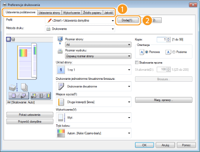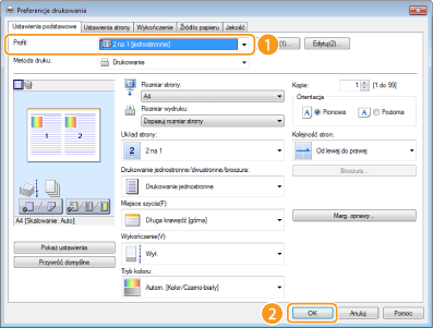Określanie kombinacji ustawień, jak np. drukowanie „1-stronne w orientacji poziomej na papierze w formacie A4” przy każdym drukowaniu, może być czasochłonne. Jeśli często używane kombinacje ustawień wydruku zostaną zarejestrowane jako „profile”, skonfigurowanie ustawień wydruku będzie wymagało jedynie wybrania profilu z listy. W tej sekcji opisany został sposób rejestracji profili i drukowania za ich pomocą.