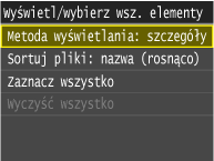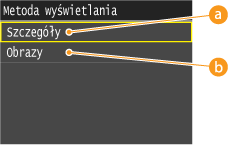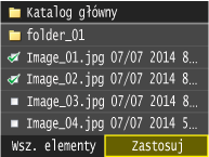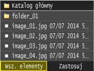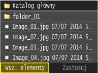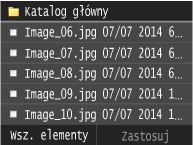 Metodę wyświetlania można zmienić z <Szczegóły> (wyświetlanie nazw plików i dat modyfikacji) na <Obrazy> (widok podglądu). Wyświetlenie podglądu obrazów umożliwia sprawdzenie zawartości plików przed jego wybraniem do wydruku.