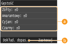 Regulacja gęstości druku dla każdego koloru: <Żółty>, <Amarantowy>, <Cyjankowy> i <Czarny>.