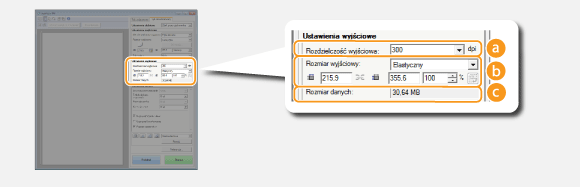 Podwojenie rozdzielczości wyjściowej powoduje 4-krotne zwiększenie rozmiaru pliku obrazu. Jeśli rozmiar pliku będzie za duży, ilość pamięci może być niewystarczająca lub może wystąpić inny błąd. Należy ustawić wartość odpowiadającą minimalnej rozdzielczości dla danego przeznaczenia.