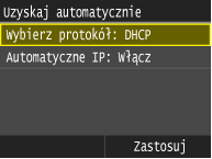 Opcję należy wybrać, aby włączyć automatyczne przypisywanie adresu IP za pośrednictwem protokołu DHCP. Wyświetlana na ekranie informacja <Uzyskaj automatycznie: Włącz> oznacza, że automatyczne adresowanie jest włączone.