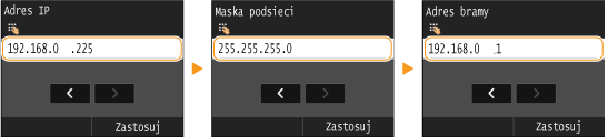 Ustawienia należy konfigurować w następującej kolejności: <Adres IP>  <Maska podsieci>  <Adres bramy>.