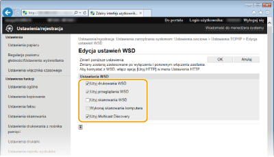 Zaznaczenie tego pola wyboru umożliwia uzyskanie informacji o urządzeniu przez komputer za pomocą interfejsu WSD. To pole wyboru jest zaznaczane automatycznie po zaznaczeniu pola wyboru [Użyj Drukowania WSD]. [Użyj skanowania WSD]