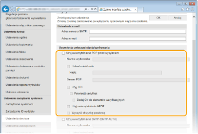 Aby skonfigurować szczegółowe ustawienia e-mail , należy użyć Zdalnego interfejsu użytkownika. Aby uzyskać szczegółowe informacje dotyczące wymaganych ustawień, należy skontaktować się z dostawcą Internetu lub administratorem sieci.
