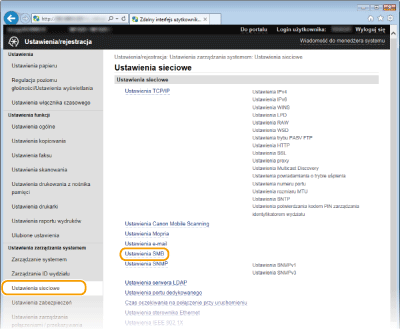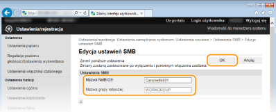 Blok komunikatów serwera (SMB) to protokół umożliwiający udostępnianie zasobów, takich jak pliki i drukarki, kilku urządzeniom w sieci. Urządzenie używa protokołu SMB do przechowywania zeskanowanych dokumentów w folderze udostępnionym. W zależności od sieci konieczne może być określenie nazwy NetBIOS i nazwy grupy roboczej.