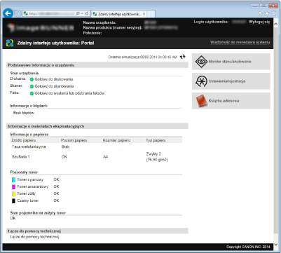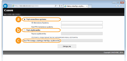 Pozwala wykonywać wszystkie operacje i konfigurować wszystkie ustawienia w Zdalnym interfejsie użytkownika. Wprowadź poprawny identyfikator w polu [ID menedżera systemu] oraz PIN w polu [PIN menedżera systemu] (