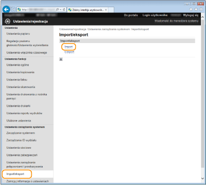 Dane ustawień lub opcje menu można zapisać na komputerze, natomiast zapisane dane można zarejestrować w urządzeniu. Istnieje możliwość importu wyeksportowanych danych. Jeżeli używany jest ten sam model, dane wyeksportowane z tego urządzenia mogą być importowane przez inne urządzenia i vice versa. Operacje te można wykonać tylko po zalogowaniu się w trybie menedżera systemu.
