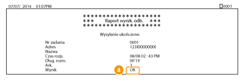 „OK” oznacza, że transmisja zakończyła się powodzeniem, natomiast „NG” i trzy cyfry (kod błędu) oznaczają niepowodzenie transmisji (