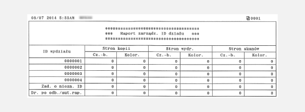 Gdy włączona jest funkcja Zarządzanie identyfikatorami wydziałów, można sprawdzić łączną liczbę wydruków dla każdego identyfikatora <ID wydziału>, drukując raport funkcji Zarządzanie identyfikatorami wydziałów. Kontrola łącznej liczby wydruków pozwala na lepsze zarządzanie zapasami papieru i toneru.