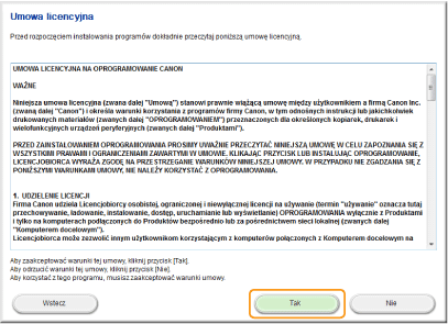 Przeczytaj umowę licencyjną i kliknij przycisk [Tak], aby zaakceptować.
