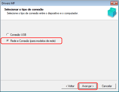 Se a seguinte tela for exibida. selecione [Rede e Conexão (para modelos de rede)] → clique em [Avançar].