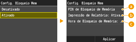 Para guardar documentos recebidos na memória, defina <Config. Bloqueio Mem> como <Ativado>. Também pode especificar definições opcionais, como, por exemplo, uma definição de segurança que torna necessária uma palavra-passe para desbloquear a função e uma definição de tempo que especifica um período de tempo durante o dia em que os documentos recebidos são guardados na memória.