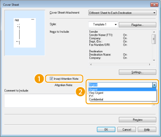 Estão disponíveis notas de atenção como "Urgente" e "Confidencial". Também pode introduzir carateres diretamente em [Attention Note] (Nota de atenção) em vez de selecionar uma nota na lista.