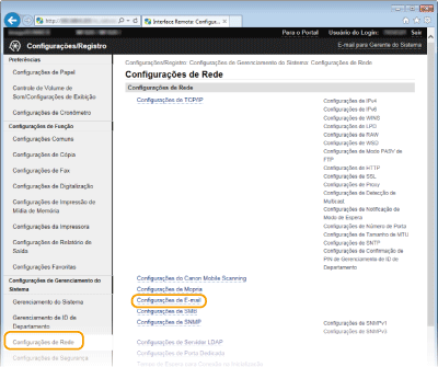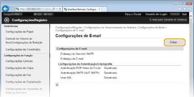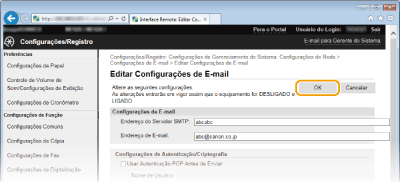 Utilize a UI Remota para configurar definições detalhadas de correio eletrónico. Para obter mais informações sobre as definições necessárias, contacte o fornecedor de serviços de Internet ou o administrador de rede.
