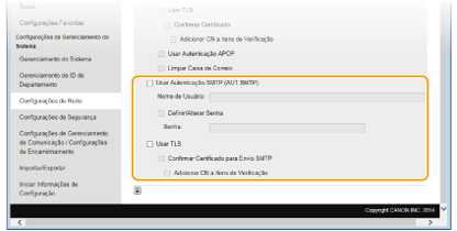Selecione a caixa de verificação para utilizar TLS para codificar a comunicação com o servidor SMTP. Selecione a caixa de verificação de [Confirmar Certificado para Envio SMTP] ou [Adicionar CN a Itens de Verificação] consoante as suas necessidades.