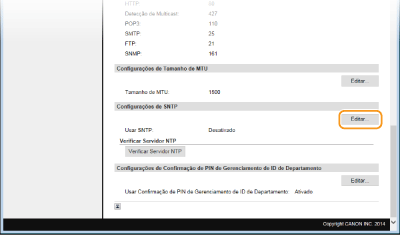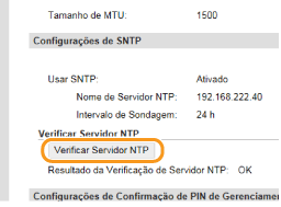 [Configurações de Rede] [Configurações de TCP/IP] e clique em [Verificar Servidor NTP] em [Configurações de SNTP]. Se a ligação tiver sido estabelecida corretamente, é apresentado o resultado mostrado abaixo. Tenha em atenção que esta operação não ajusta o relógio do sistema.![]() |