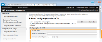 O SNTP (Simple Network Time Protocol) permite ajustar o relógio do sistema utilizando o servidor de hora da rede. O protocolo é normalmente utilizado para sincronizar a máquina e um servidor, tal como acontece, por exemplo, quando a máquina precisa de aceder a um servidor LDAP com a autenticação de segurança que foi ativada. A hora é ajustada com base na hora universal coordenada (UTC), por isso especifique a definição de fuso horário antes de configurar o SNTP (Configurações de Data/Hora). É possível especificar as definições de SNTP através da UI Remota.