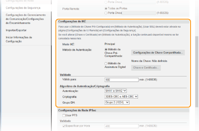 Especifique as definições [Válido para] e [Autenticação]/[Criptografia]/[Grupo DH].