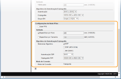 Especifique as definições de AH/ESP, que é adicionado aos pacotes durante a comunicação através de IPSec. É possível utilizar AH e ESP simultaneamente. Também pode selecionar se pretende ou não ativar a função PFS para reforçar a segurança.