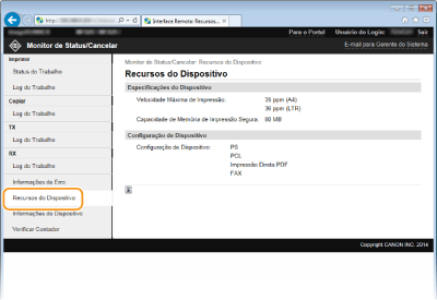 São apresentadas informações relativas à máquina e ao administrador de sistema. Essas informações são definidas em [Gerenciamento do Sistema] na página [Configurações/Registro].