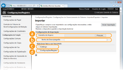 Pode guardar os dados de definições das opções dos menus no computador ou registar os dados guardados na máquina. É possível importar os dados exportados. Se utilizar o mesmo modelo, outras máquinas podem importar os dados exportados da máquina e vice versa. Essas operações só podem ser efetuadas se iniciar sessão no Modo do Administrador de Sistema.