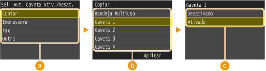 Todas as definições relativas à utilização da gaveta de papel e ao método de alimentação de papel são apresentadas com breves descrições. As predefinições estão assinaladas com uma cruz (