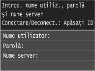 Specificare autentificare server LDAPDupă ce atingeţi <Fax> sau <Scanare>, este afişat un ecran de autentificare înainte de a trece la ecranul dorit. Introduceţi utilizatorul, parola şi numele serverului corect pentru a activa utilizarea funcţiilor dorite. Specificarea autentificării prin server LDAP (E-mail/Director partajat/Server fişier)