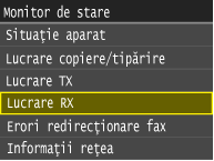 Vă permite să imprimaţi Raportul de rezultate RX de fiecare dată când documentele sunt stocate în memorie. Pentru a imprima rapoarte, atingeţi <Pornit>. Trebuie să setaţi şi <Raport rezultat RX> la <Pornit>.