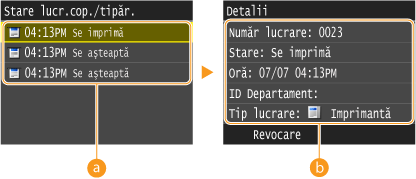 ![]() <Jurnal lucrări de imprimare>Afişează o listă a documentelor care au fost imprimate. <OK> se afişează când un document a fost imprimat şi <Eroare> se afişează când un document nu a putut fi imprimat, deoarece a fost anulat sau a apărut o eroare.