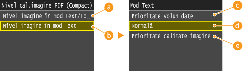 <PDF (Compact)> comprimă fotografiile şi imaginile din documente mai mult decât <PDF>. Fişierul va fi mai mic, dar calitatea imaginii pentru anumite documente sau numărul de documente care pot fi scanate deodată poate fi mai mic. Dacă selectaţi <PDF (Compact)>, puteţi specifica nivelul de comprimare.