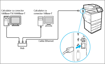 Conectaţi aparatul la un calculator prin intermediul unui router. Utilizaţi un cablu LAN pentru a conecta aparatul la router.