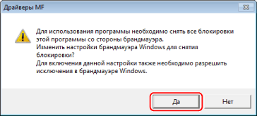 Если во время установки открывается следующее диалоговое окно, выберите [Да]. Блокировка брандмауэром Windows снята, и установку можно продолжить.