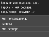 Указание LDAP для аутентификации сервераПосле выбора <Факс> или <Сканирование> отображается экран входа в систему перед сменой на необходимый экран. Введите верное имя пользователя, пароль и имя сервера для возможности использования необходимых функций. Указание аутентификации сервера LDAP (электронная почта/общая папка/файловый сервер)