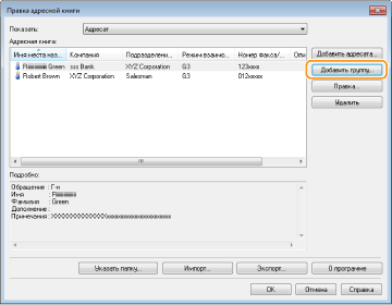 В этом разделе описывается регистрация адресатов в адресной книге для факсов, отправляемых с компьютера. Можно выбрать отдельных адресатов из списка адресатов, зарегистрированных в адресной книге, чтобы создать одного группового адресата (групповой набор). Эта функция используется для отправки данных одновременно нескольким адресатам.