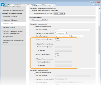 Если включены обе версии SNMP, рекомендуется задать для разрешений SNMPv1 на доступ к объектам MIB значение [Только чтение]. Разрешение на доступ к объектам MIB можно задать отдельно в SNMPv1 и SNMPv3 (а также для каждого из пользователей в SNMPv3). При выборе [Чтение/запись] (разрешение на полный доступ) в SNMPv1 снижает эффективность функций безопасности, которые отличают протокол SNMPv3, поскольку большинство параметров аппарата можно контролировать посредством SNMPv1.