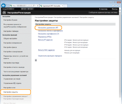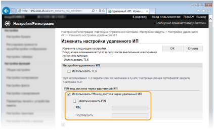 <Настройки управления системой> <Настройки удаленного ИП> <Настройки безопасности доступа к удаленному ИП> <Вкл.> Введите PIN <Применить> Введите PIN («Подтвердить») <Применить>.Если настройки Удаленного ИП инициализированыPIN для Удаленного ИП также инициализирован. После инициализации установите новый PIN. Инициализация меню