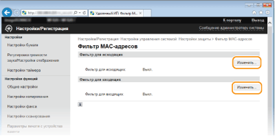 ![]() Проверка на наличие ошибок ввода При неправильном вводе MAC-адресов доступ к аппарату из Удаленного ИП может быть невозможен. В этом случае необходимо указать для <Фильтр MAC-адресов> значение <Выкл.>. Фильтр MAC-адресов