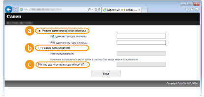 Можно выполнять все операции и задавать настройки Удаленного ИП. Введите нужный идентификатор [ИД администратора системы] и PIN [PIN администратора системы] (