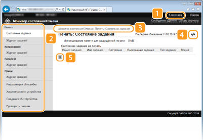 Отображение состояния документов для печати и журналы печати, копирования, отправки и получения документов. Можно также проверить состояние аппарата.