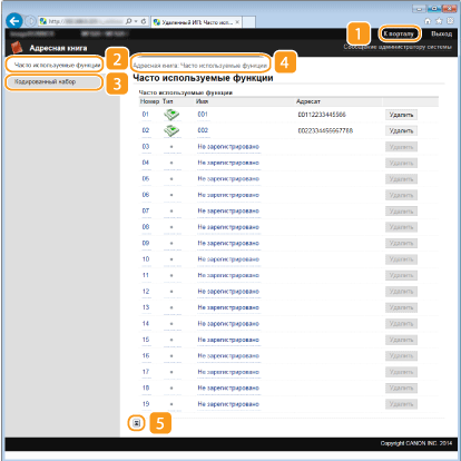 Отображение кодов кодированного набора и списка избранного, зарегистрированных в адресной книге. При выполнении входа в систему в режиме администратора системы можно регистрировать/изменять адресную книгу. Регистрация адресной книги с помощью Удаленного ИП