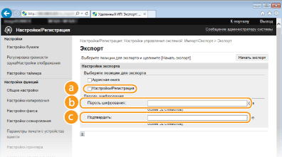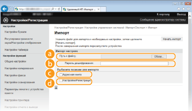 Данные настроек параметров меню можно сохранить на компьютере или зарегистрировать уже сохраненные данные на аппарате. Экспортированные данные можно импортировать. Одинаковые модели могут импортировать данные, экспортированные с данного аппарата, и наоборот. Эти операции возможны только при входе в систему в режиме администратора системы.