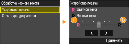 Если результаты копирования черного или темного текста неудовлетворительные, следующие настройки позволят улучшить воспроизведение цветов. Этот параметр можно настроить отдельно для податчика и стекла экспонирования.