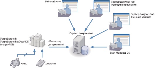 iW Document Server является сервером управления документами, использующими в качестве клиента iW Document Server Client Function или iW Desktop. Помимо документов, созданных с использованием этих клиентов, существует также возможность сохранения документов, отсканированных подключенными по сети многофункциональными цифровыми устройствами Серия iR и документ-сканерами серии DR. Это позволяет построить систему управления документами с широкими функциональными возможностями для эффективного управления сохраненными документами.