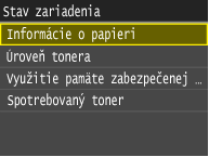 , zobrazí sa obrazovka, ktorá vám umožní skontrolovať stav tlačených, odosielaných alebo prijímaných dokumentov, ako aj stav stroja, napríklad úrovne tonerov alebo informácie o nastavení siete, ako je adresa IP stroja.