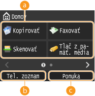 na ovládacom paneli. Na domovskej obrazovke sa zobrazia tlačidlá na prístup k funkciám. Môžete pridať/odstrániť tlačidlá domovskej obrazovky a preusporiadať ich tak, aby sa ľahšie používali.