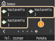 <Obľúbené nastavenia kopírovania> <Obľúbené nastavenia faxovania> <Obľúbené nastavenia skenovania>Zobrazí často používané nastavenia uložené pre jednotlivé funkcie kopírovania, faxovania a skenovania. <Kópia ID karty> je predom uložené pre <Nastavenia 1>. Uloženie často používaných nastavení kopírovania