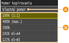 Kópie môžete zväčšovať alebo zmenšovať pomocou prednastaveného pomeru kopírovania, napríklad <A5 -> A4> alebo nastavením užívateľského pomeru kopírovania v prírastkoch po 1 %.